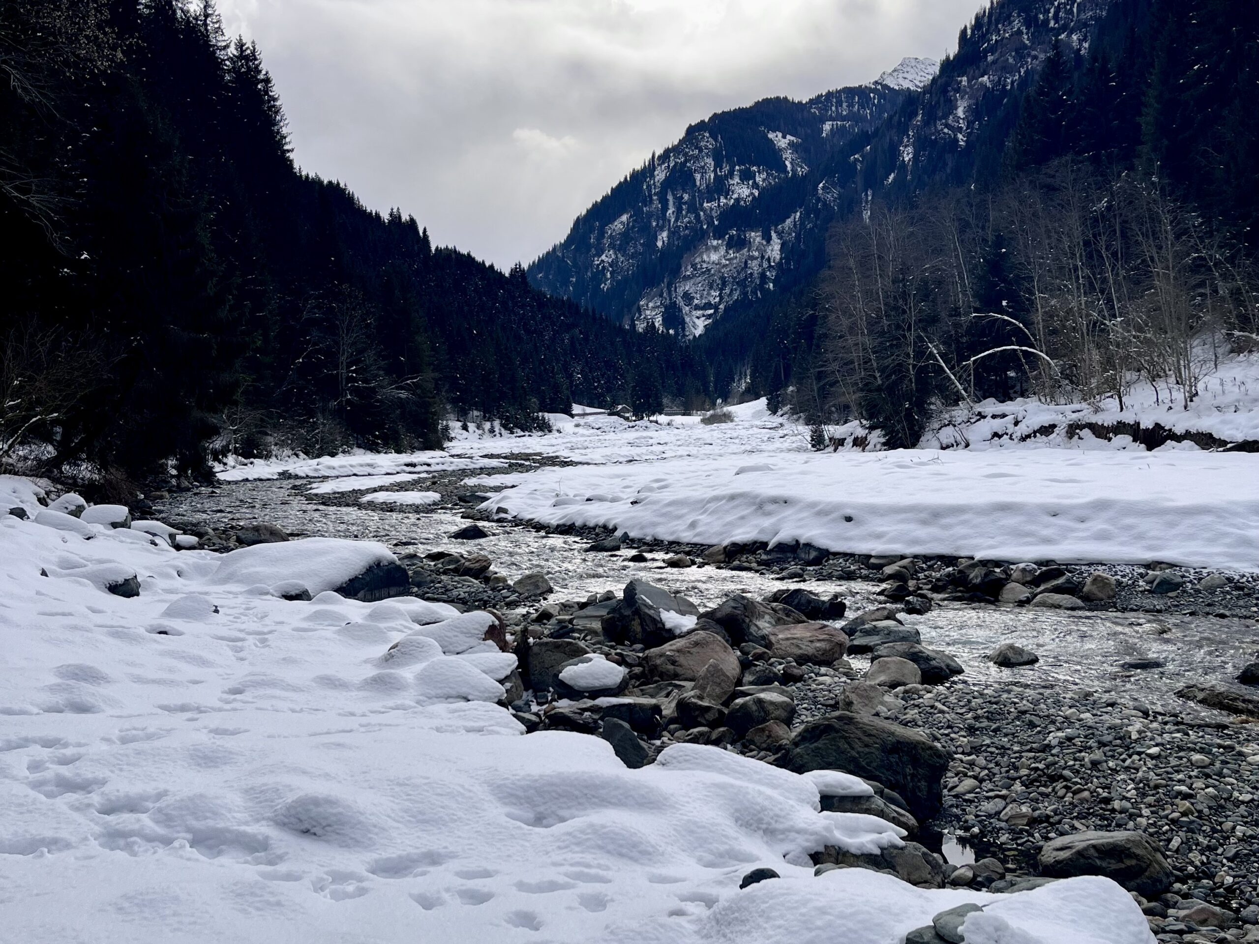 Auf meiner Schneeschuhwanderung im Hollersbachtal blicke ich über die verschneite Wald- und Bachlandschaft.