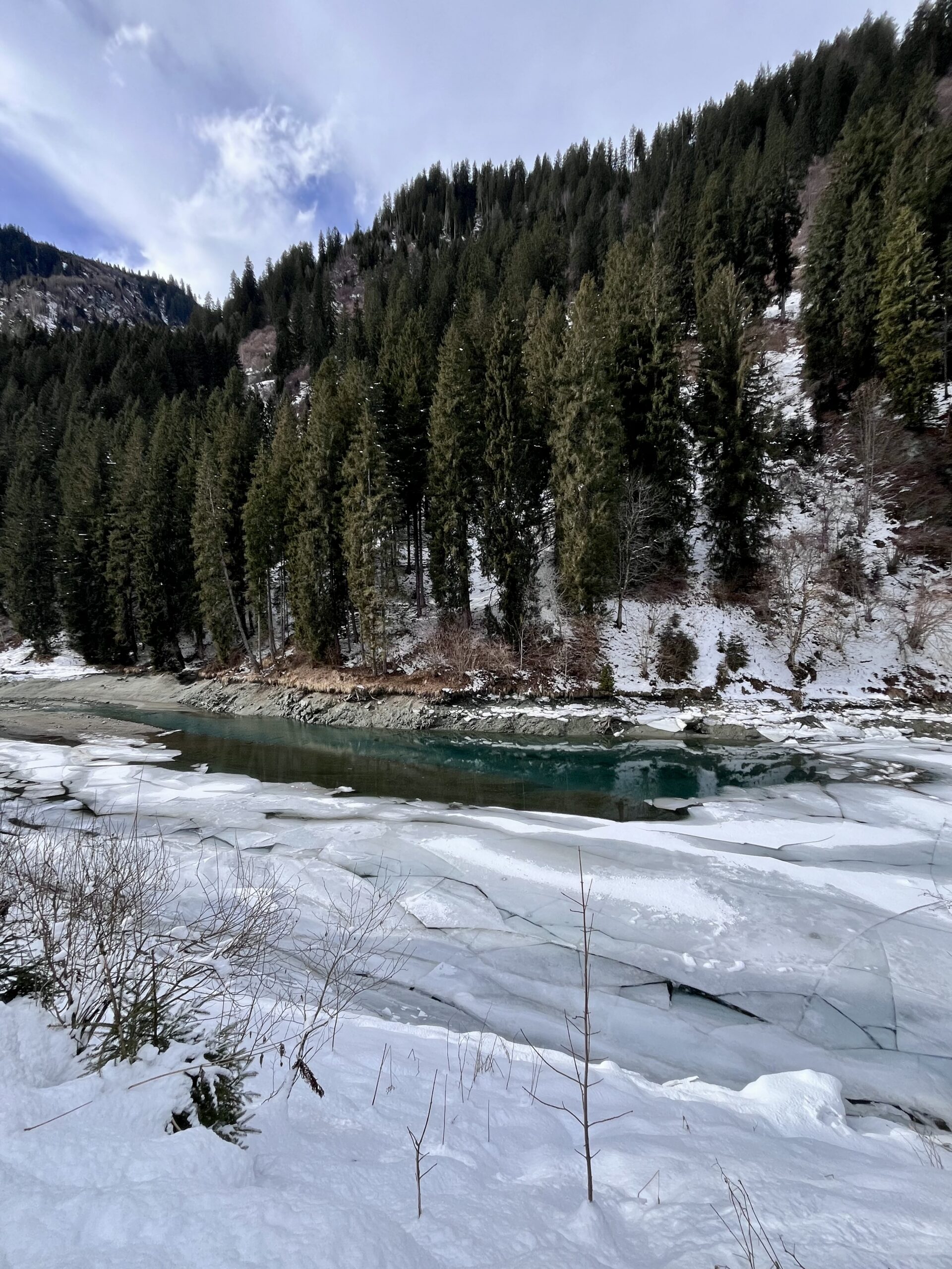 Von meinem Standpunkt am Ufer aus sehe ich das türkisfarbene Wasser des Hollersbaches zwischen den Eisschollen.