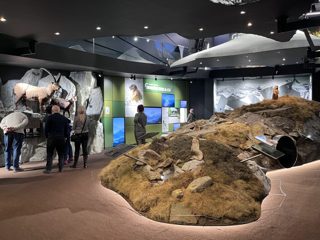 Mit dem Adlerflug startet meine Reise durch die Nationalparkwelten. Ich schwebe über den Hohen Tauern und bewundere die höchsten Gipfel sowie verschiedene Landschaften mit Adleraugen. Mit diesem Einstieg schafft es die Ausstellung, die Dimensionen des Nationalparks aufzuzeigen. Eine Ebene tiefer finde ich mich in der Heimat von Murmeltieren und weiteren Tieren und Pflanzen wieder und erfahre, wie viel Leben trotz des scheinbar lebensfeindlichen, langen Winters in diesen Hochlagen herrscht.
