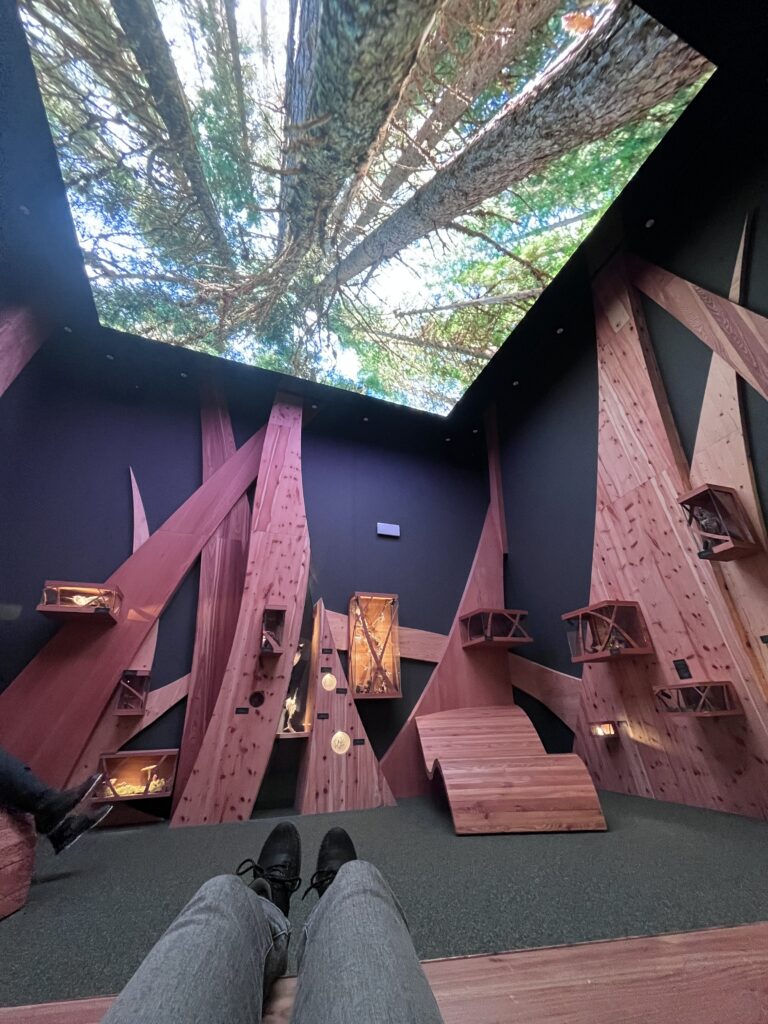 Im „Mythos Bergwald“ blicke ich nach oben zum Deckenkino und tauche mitten in die vielschichtige, lebendige Struktur des alpinen Waldes ein.