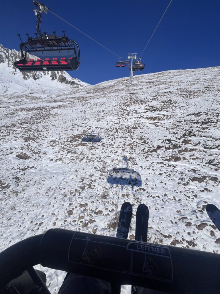 Unterhalb des Sessellifts ist erkennbar, dass der natürliche Schnee an schneearmen Hangflächen nicht für den Wintersport ausreicht.