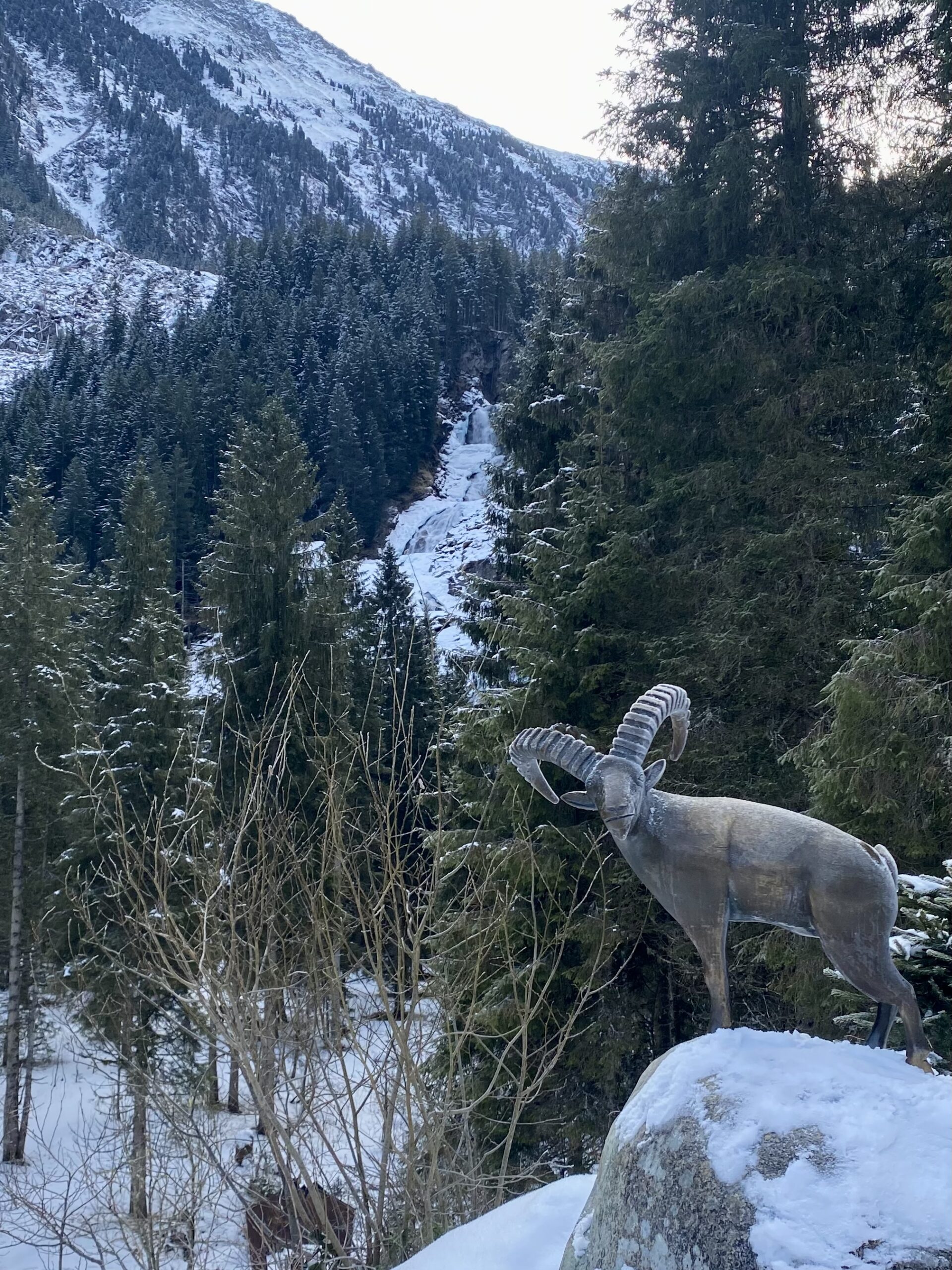 Mich erblickt eine Steinbockstatue, während ich in der Ferne die mächtigen Krimmler Wasserfälle bestaune.