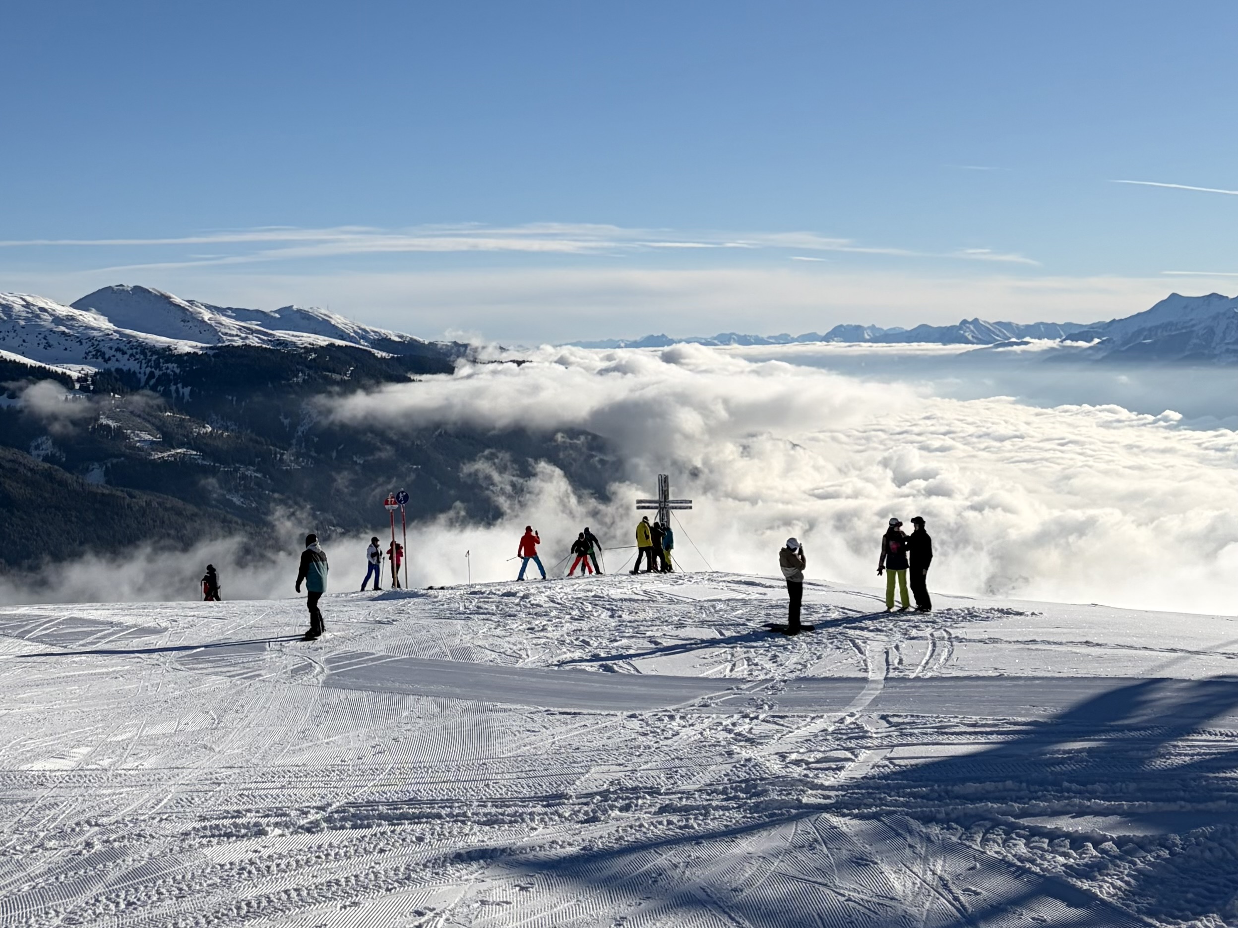 Im Skigebiet KitzSki rund um Kitzbühel, Kirchberg und Mittersill in den Kitzbüheler Alpen beeindruckt ein spektakulärer Ausblick über den Wolken.