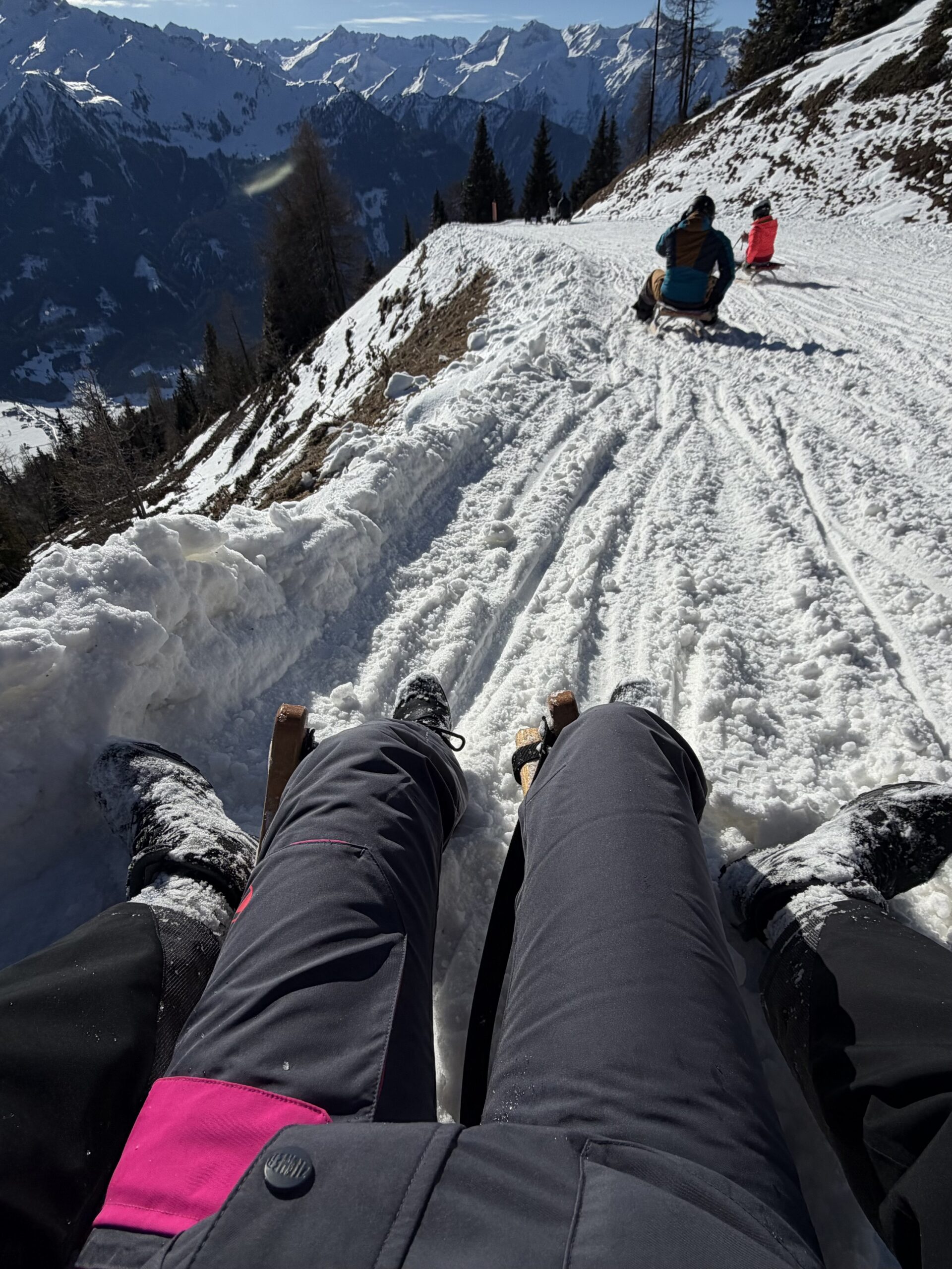 Auf dem robusten Holzschlitten liefern wir uns beinahe ein Wettrennen mit weiteren Rodelbegeisterten hinab ins verschneite Tal.